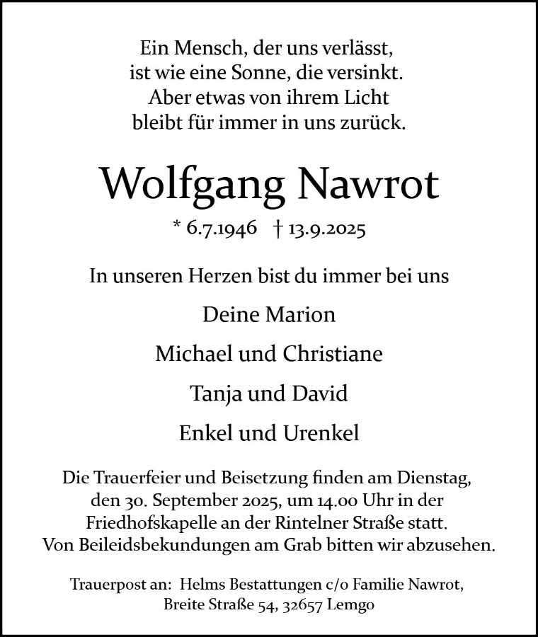 wir wünschen Ihnen für die kommende Zeit viel Kraft und dass es Ihnen gelingt, dankbar auf die positiven Erinnerungen zurückzublicken. Diese Gedenkseite möge Ihnen dabei helfen, Ihre Trauer zu teilen und das Andenken gemeinsam wachzuhalten.